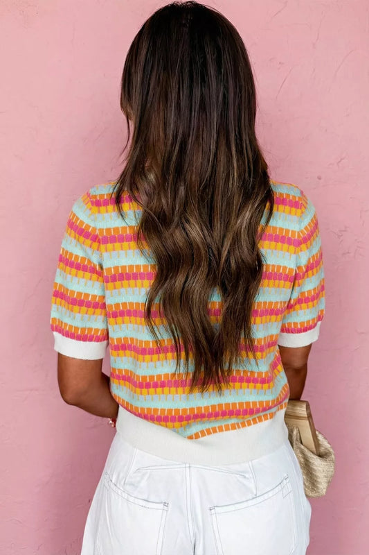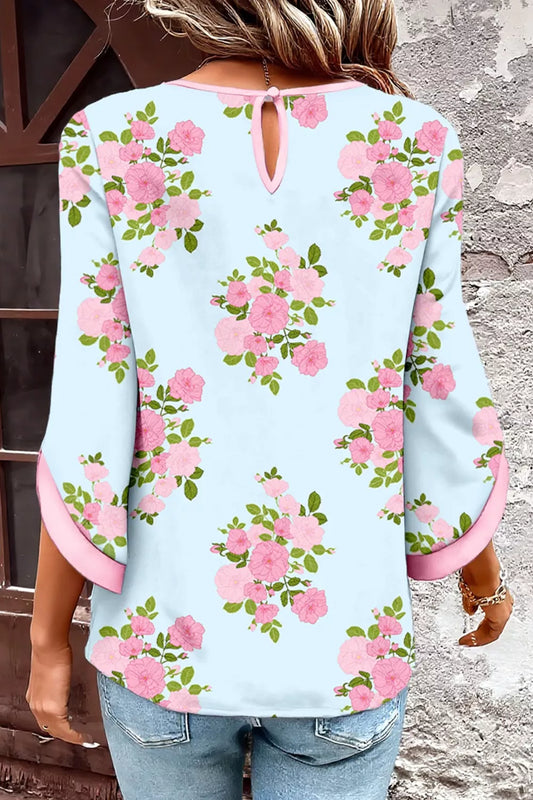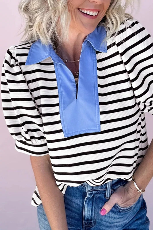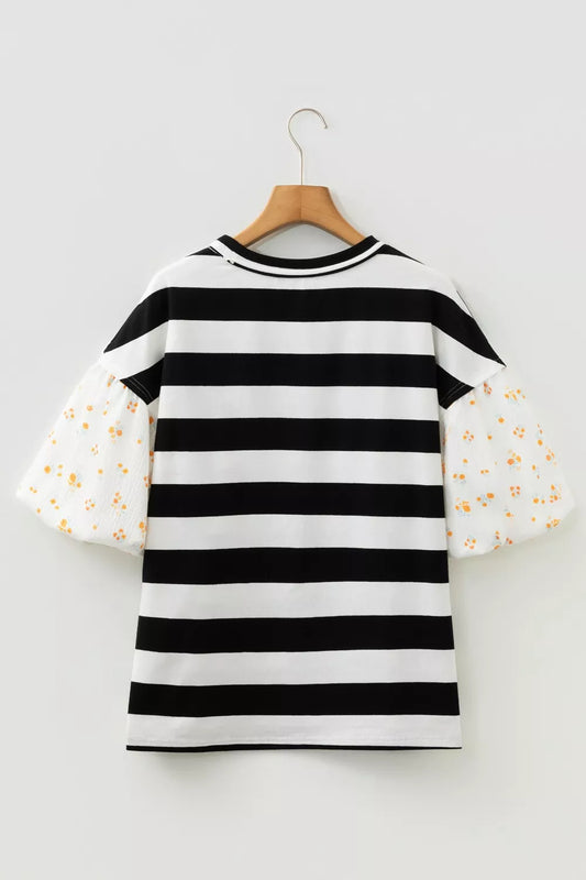 Stripe Floral Print Puff Sleeve Patchwork Blouse