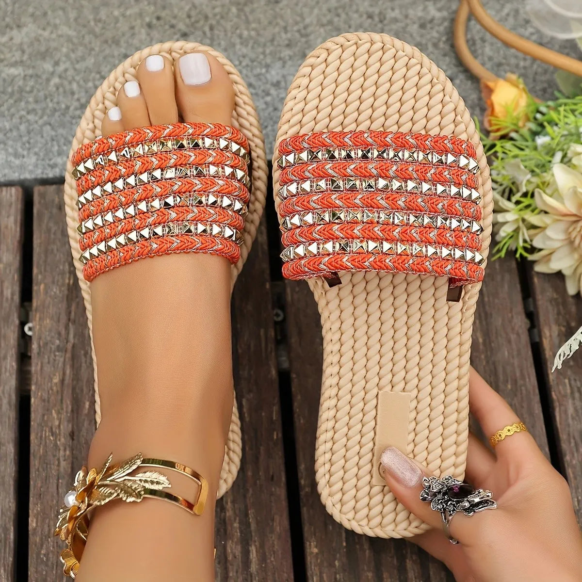 Studded Open Toe Flats Sandals